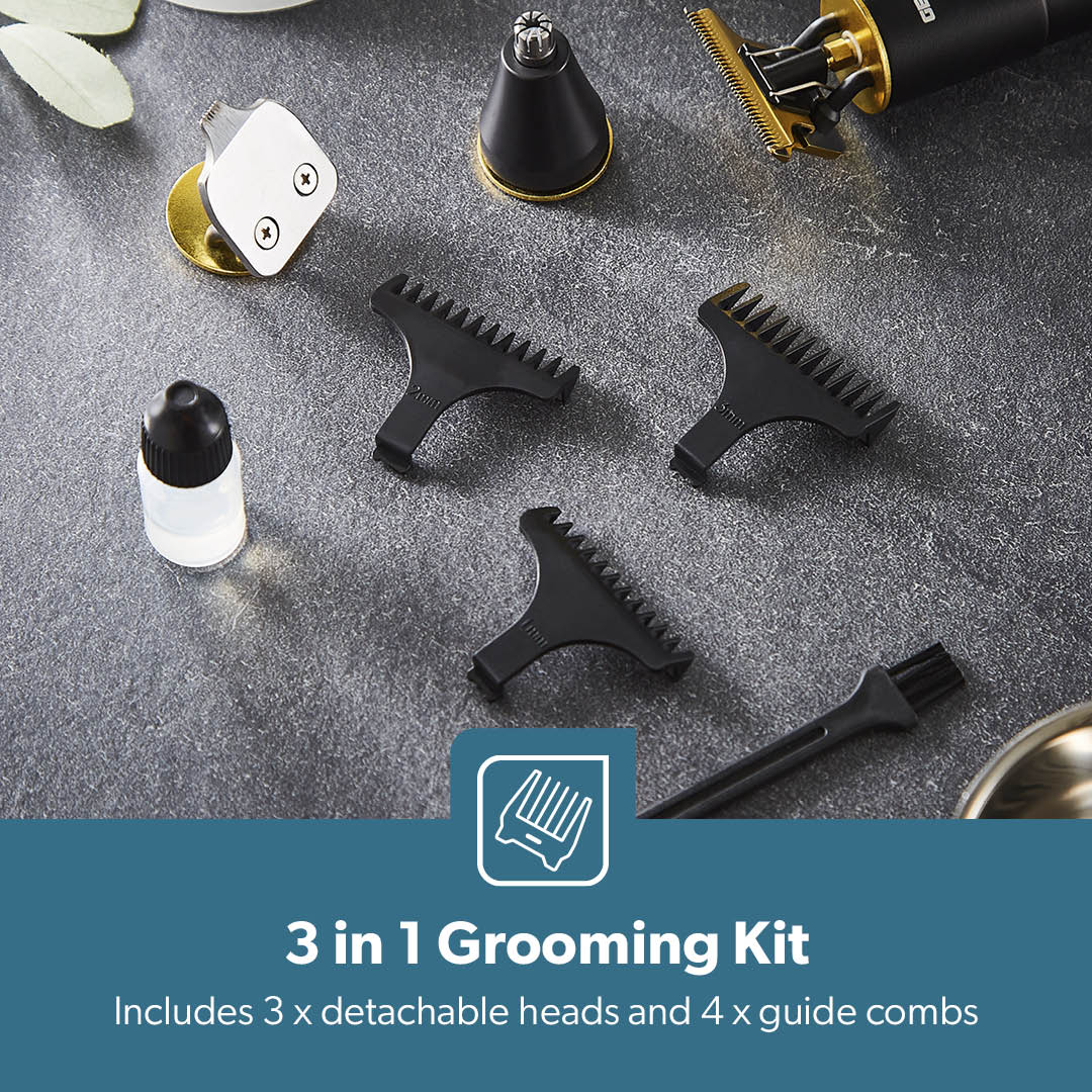 The 3-In-1 Rechargeable Black and Gold Grooming Kit is the ultimate grooming solution for modern men. This sleek and stylish kit includes a rechargeable trimmer, foil shaver, and nose hair trimmer, all housed in a sophisticated black and gold design. Whether you're looking to keep your beard trimmed, shape your sideburns, or tackle unwanted nose hair, this kit has you covered.