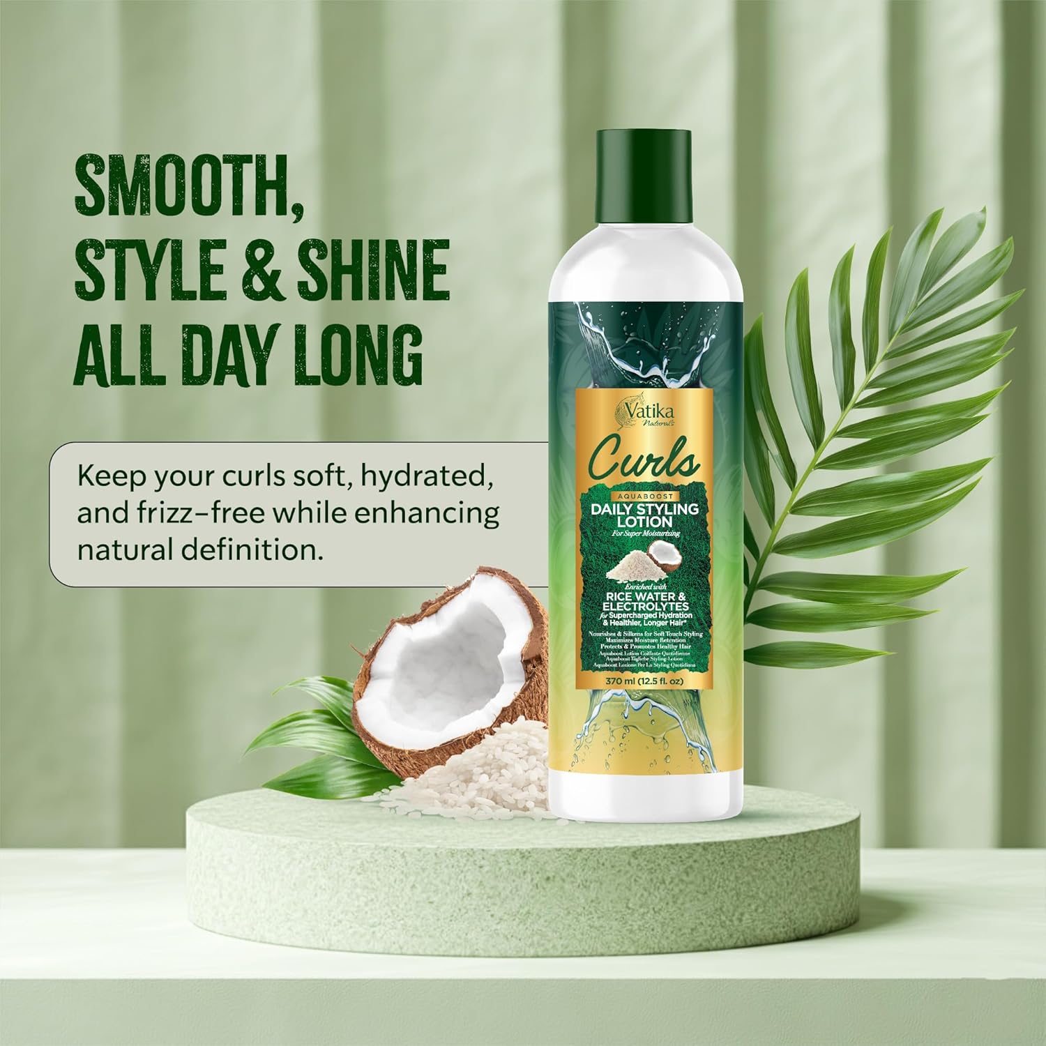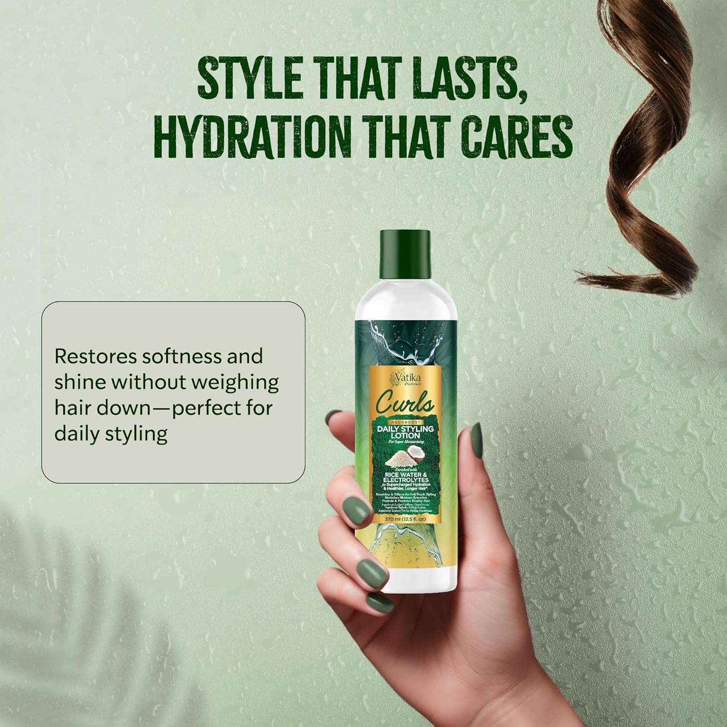 Vatika Naturals Curls AQUABOOST Daily Styling Lotion with Rice Water & Electrolytes – Hydrating, Moisturizing & Frizz-Control Styling Cream for Curly, Wavy & Textured Hair, 370ml