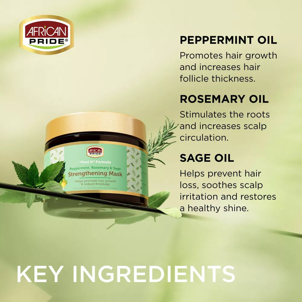 The Feel It Formula Strengthening Masque is infused with Peppermint, Rosemary & Sage Oil and also rich in Proteins. It helps to deeply strengthen, hydrate your hair strands from root to tip, while preventing breakage Helps promote Hair Growth