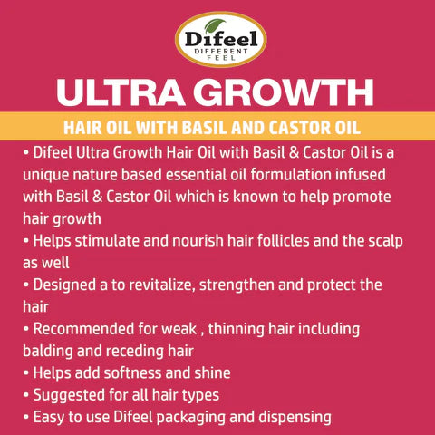 • GROWTH OIL: Difeel Ultra Growth Hair Oil with Basil & Castor Oil is a unique nature based essential oil formulation infused with Basil & Castor Oil which is known to help promote hair growth.