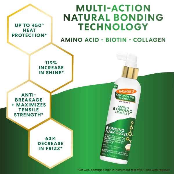 PALMER’S BONDING HACK: For the most intense shine, add 2 pumps of Palmer’s® Coconut Oil Formula® Amino Bonding Complex Healing Oil to Palmer’s Coconut Oil Formula Amino Bonding Complex Hair Gloss and mix. Saturate hair from root to tip, cover with plastic cap. Then sit under a hooded dryer, steamer, or warm the outside of your cap with a blow dryer for 15 minutes. Rinse completely.