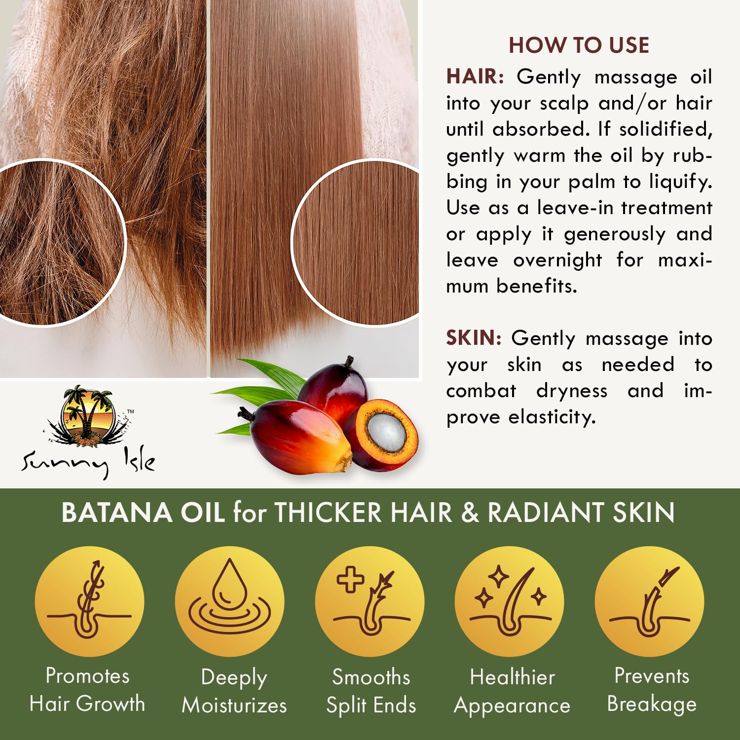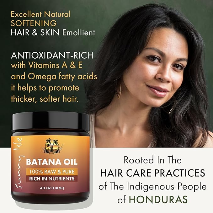 - NOURISHING & HYDRATING: Sunny Isle 100% Raw & Pure Batana Oil is unrefined, nutrient-rich and is traditionally used to moisturize the hair and scalp to stimulate hair growth and rejuvenate damaged hair. It is also an excellent moisturizer for skin.