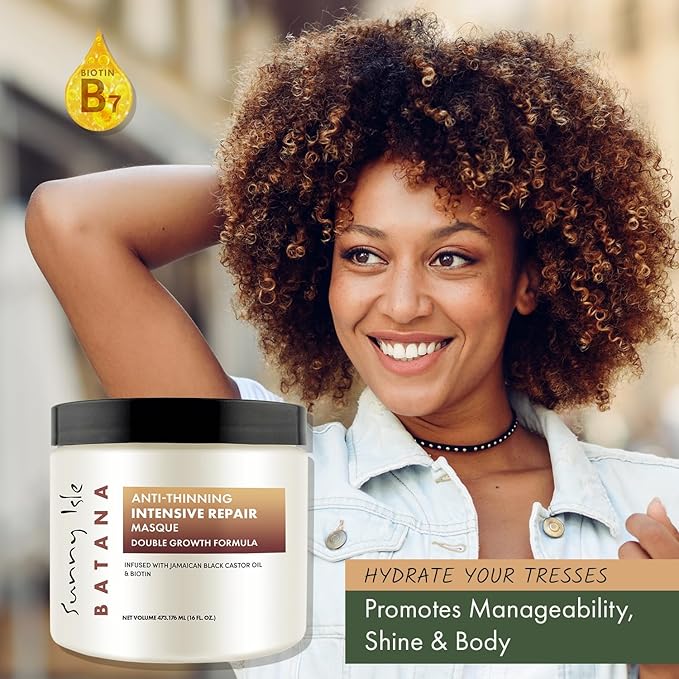 • BATANA ANTI-THINNING HAIR MASQUE: Sunny Isle Batana Anti-Thinning Intensive Repair Masque formula is infused with Biotin and Jamaican Black Castor Oil. It provides an essential boost of moisture and nutrients, helping to transform brittle, lackluster strands into vibrant, longer and thicker hair. Its rich, creamy texture glides effortlessly through the hair, ensuring even distribution and maximum absorption for optimal results.